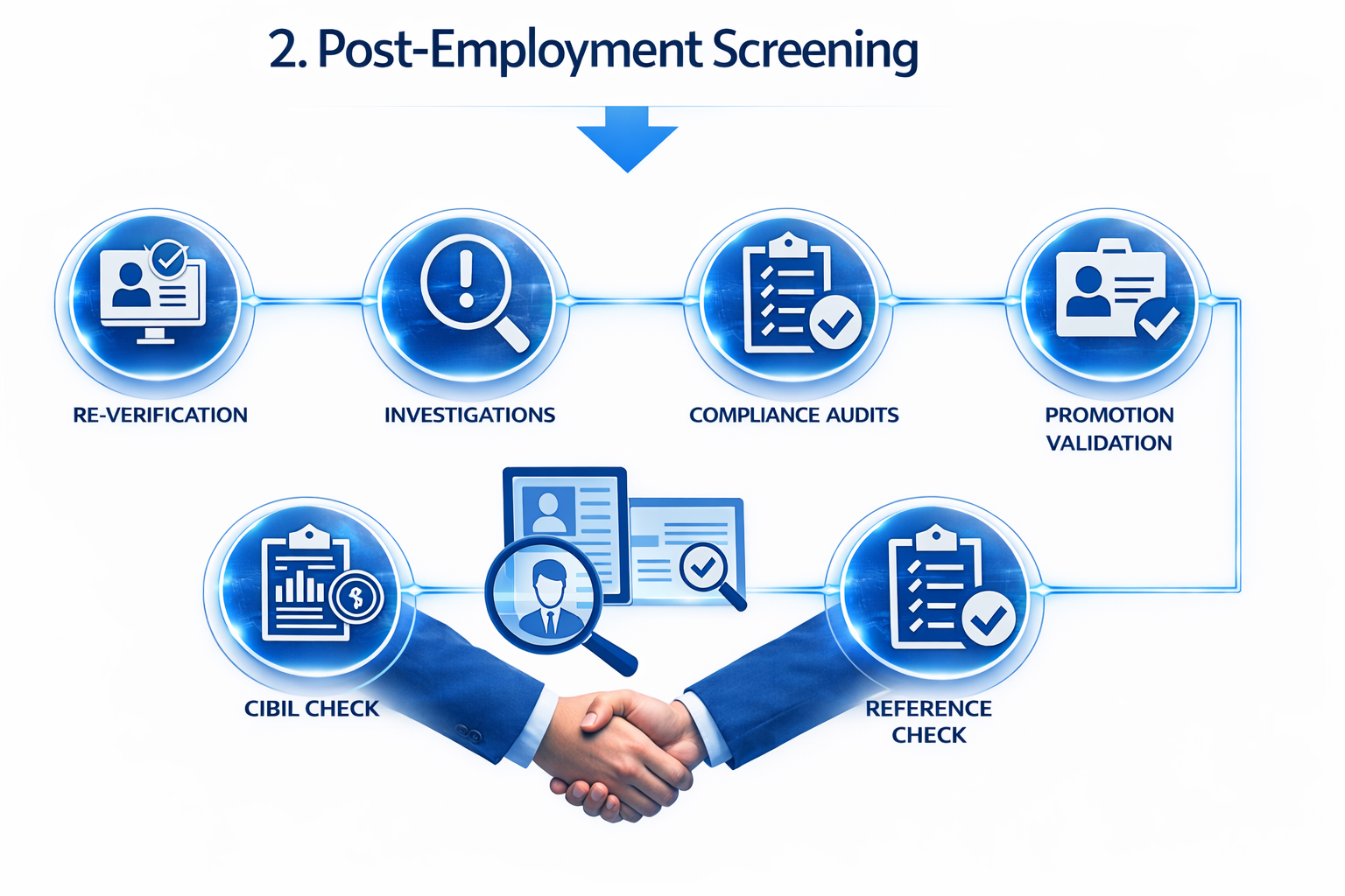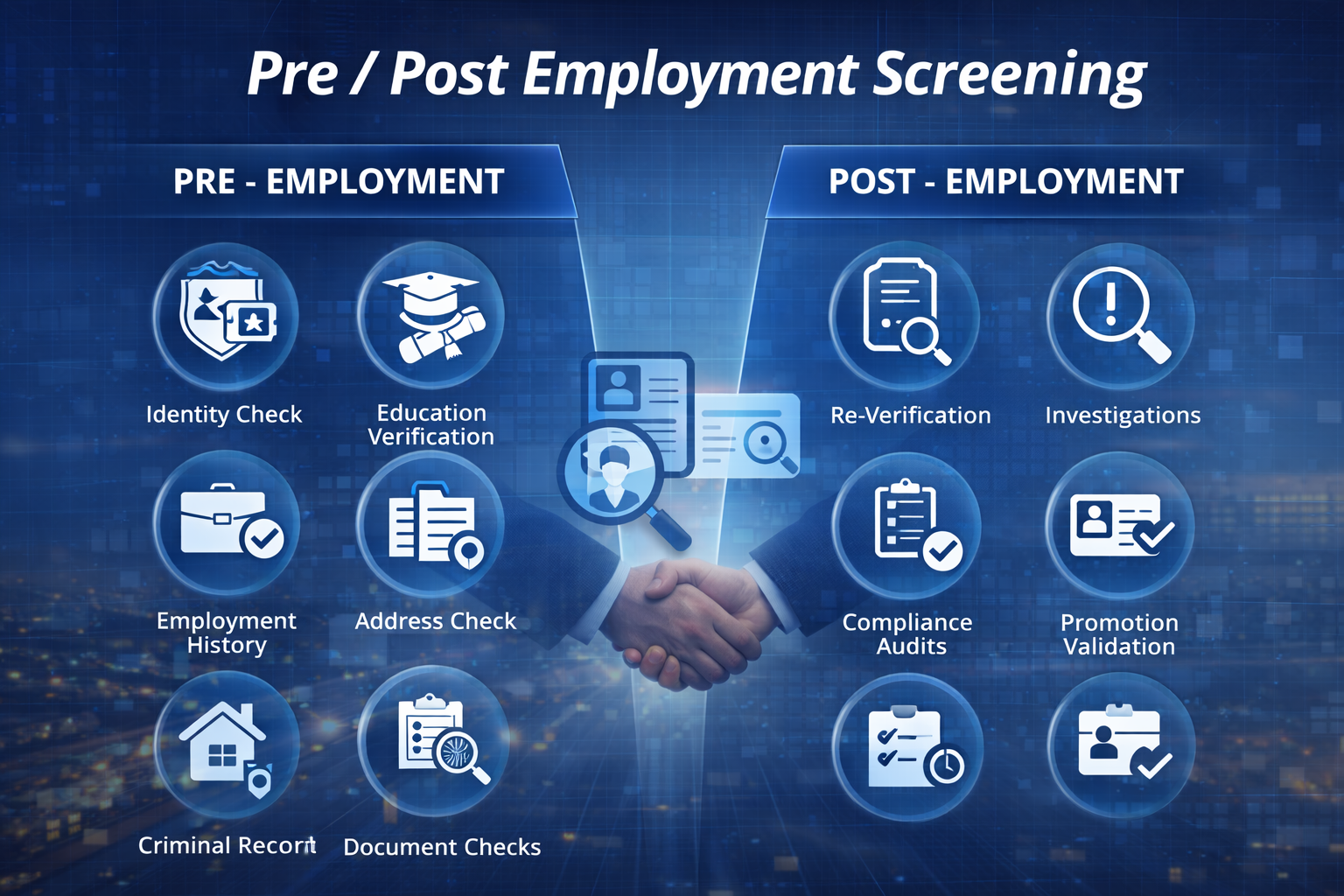 Post-Employment Screening supports organizations in re-verifying employee backgrounds, investigating misconduct, conducting compliance audits, and validating credentials for promotions or transfers. This ongoing process strengthens internal controls and ensures a secure, compliant, and trustworthy work environment.